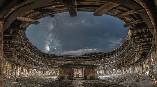 裕昌楼建于1308年,这座土楼建成后不久,楼内回廊木柱便开始从左向右倾斜,大倾斜度为15度,看起来摇摇欲坠,但经受几百年风雨侵蚀和无数次地震的考验,至今依然如故,有惊无险,故被称为“东歪西斜楼”。裕昌楼是早期股份制的产物,由刘、罗、张、唐、范五姓族人共同出资建造,共有五层18.2米,房室270间。全楼有五部楼梯,分为五大卦,底层厨房内设有水井,共22口,是福建土楼中水井多的土楼。楼内天井中心建有单层的圆形祖堂,堂前用卵石铺成的一个阴阳八卦,分五格,代表“金、木、水、火、土”。地址:福建省漳州市南靖县书洋镇下版村上节106号
